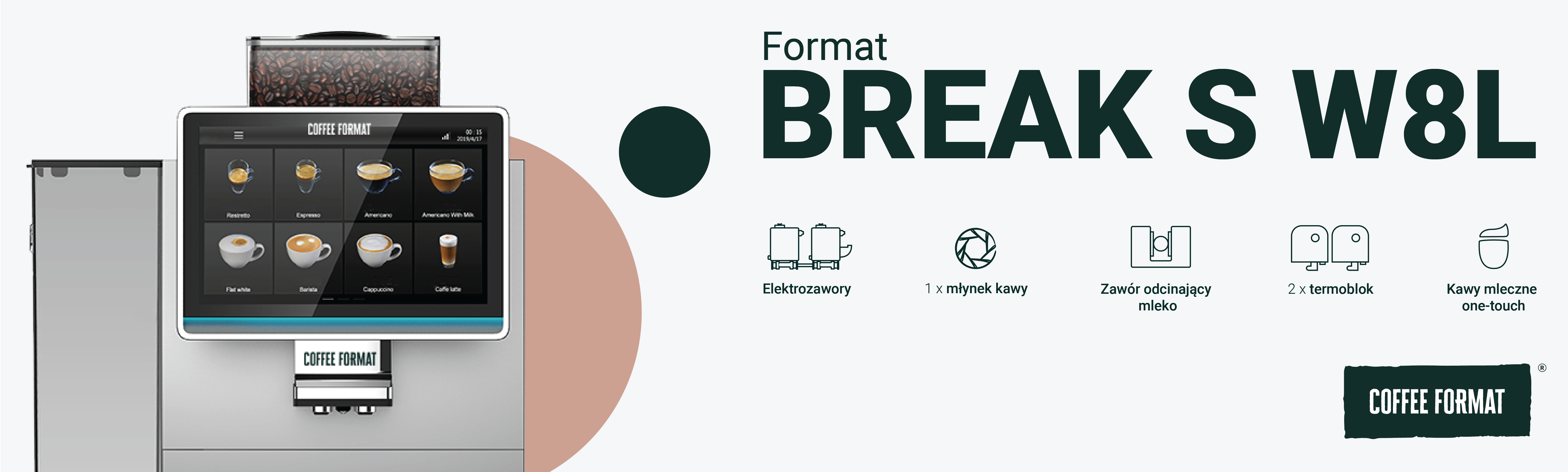 Format BREAK to profesjonalny, automatyczny ekspres do kawy. Wyposażony został w kolorowy, dotykowy wyświetlacz o wielkości aż 10,1 cala. Zapewnia on przejrzysty wgląd w wszystkie funkcje, dzięki czemu wybór napojów i obsługa ekspresu są niezwykle proste. Nowoczesny styl dopełnia lustrzany front ekspresu, dzięki czemu Format BREAK zdecydowanie wyróżnia się na tle innych urządzeń w swojej klasie. Format BREAK pozwala delektować się doskonałymi kawami dostępnymi za jednym dotknięciem przycisku. Amatorów kawowych specjałów ucieszy możliwość precyzyjnego zaprogramowania parametrów napoju. Wszystko to sprawia, że profesjonalny ekspres do kawy BREAK nie tylko zdobi lokal, ale przede wszystkim pozwala uzyskać napoje jak od profesjonalnego baristy.