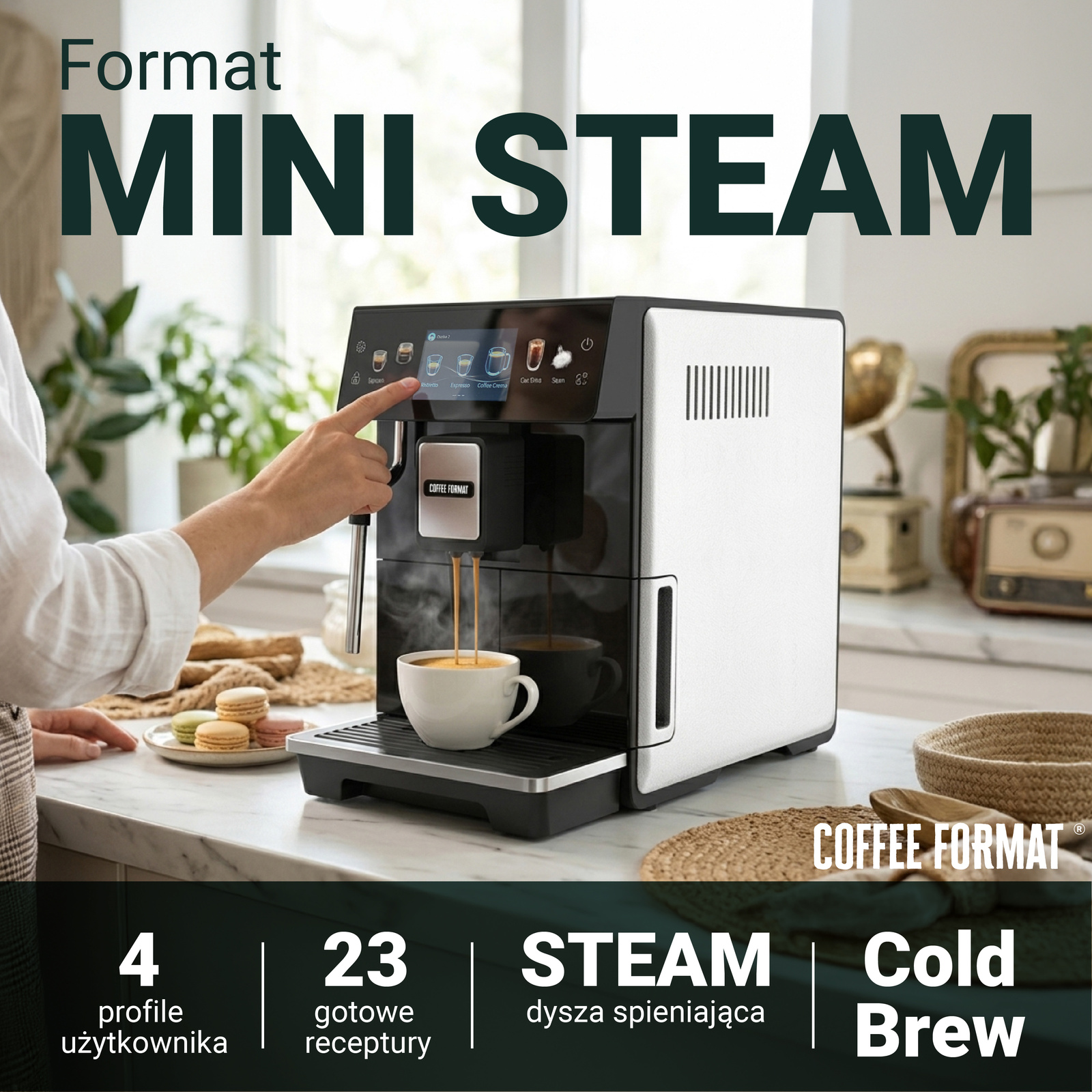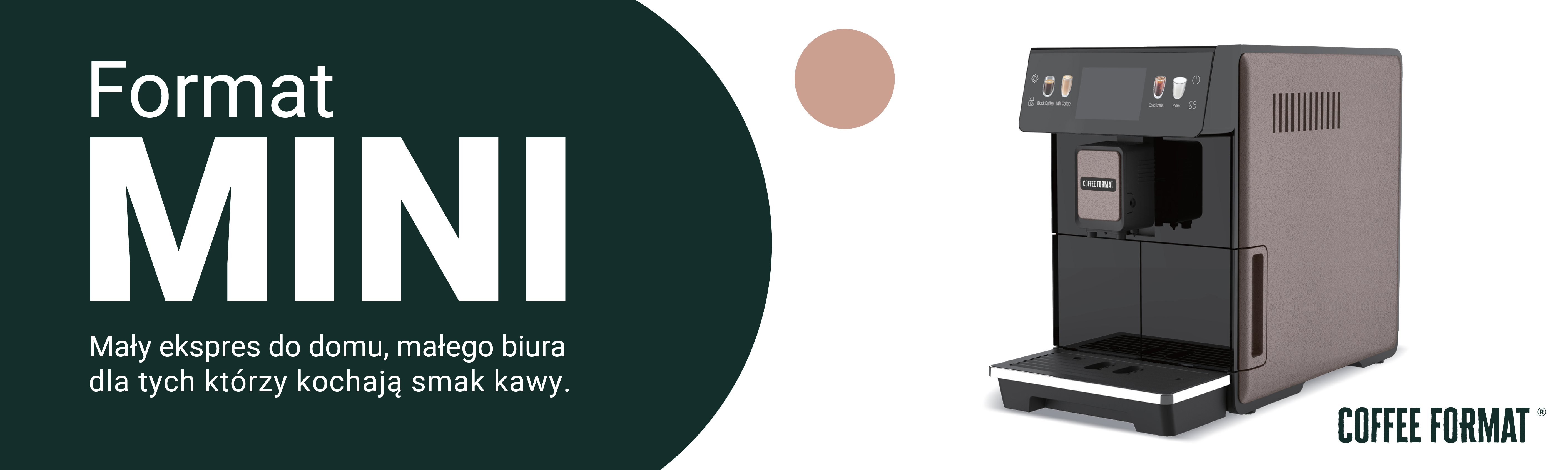 Nawet 70% społeczeństwa sięga rano po kawę. To moment, który często definiuje cały dzień. Właśnie dlatego w naszej ofercie nie mogło zabraknąć małego i przystępnego Formatu, który sprawdzi się w domu i małym biurze. MINI, jak sama nazwa wskazuje, jest niewielki – ale kawa, którą serwuje, potrafi naprawdę poprawić poranek. MINI BROWN MINI_-_bannery-04 Ekspres, który pamięta jaką kawę lubisz: Ekspres do domu i małego biura powinien serwować ulubione specjały kawowe bez skomplikowanej konfiguracji, a jednocześnie pozwalać na pełną personalizację smaku. Format MINI oferuje przejrzysty ekran dotykowy z klasycznymi napojami i propozycjami Cold Brew – gotowymi od pierwszego włączenia. Możesz także zmienić recepturę, wzmocnić kawę i zapisać ustawienia na własnym profilu użytkownika. Nazwij swój profil jak chcesz, dodaj zdjęcie i ciesz się swoją ulubioną kawą każdego dnia – dokładnie taką, jak lubisz. 4 ONE TOUCH 23 profile użytkownika kawy mleczne one touch gotowe receptury Mała kuchnia to nie problem dla Formatu MINI – zmieści się Podczas projektowania przestrzeni lub dobierania ekspresu do swojej kuchni często okazuje się, że kluczowa jest jego kompaktowość. To trochę jak gra w Tetris – wiele ekspresów oferuje świetne funkcje, ale finalnie nie pasują do wnętrza, bo są po prostu za duże. FORMAT MINI wyróżnia się swoją wąską konstrukcją na tle urządzeń w tej klasie. Dzięki temu bez problemu zmieści się nawet w niewielkiej przestrzeni, dając użytkownikom dużą swobodę i codzienną przyjemność z kawy. Kawa na zimno w upalne dni to świetny pomysł Wyobraź sobie ciepły, letni dzień – masz ochotę na kawę, ale pogoda zdecydowanie sprzyja zimnym napojom. Właśnie dlatego FORMAT MINI oferuje nie jedną, nie dwie, ale aż 7 receptur Cold Brew, czyli kawy podawanej na zimno. Możesz dodać kilka kostek lodu, odrobinę pomarańczy i cieszyć się jedną z najbardziej orzeźwiających kaw pod słońcem. Nie musisz pić jednej mieszanki kawy Wiele ekspresów domowych posiada zbyt duże zbiorniki na ziarno, przez co przez długi czas korzystamy z jednej mieszanki kawy. W Polsce działa wiele świetnych palarni, które tworzą tak dobre blendy, że aż szkoda ograniczać się tylko do jednego. Dlatego FORMAT MINI został wyposażony w zbiornik o pojemności 150 g - naszym zdaniem to idealny kompromis, który pozwala zachować świeżość ziaren i cieszyć się pełnią smaku. Format MINI w wersji STEAM Klasyczne automatyczne systemy mleczne są wygodne, ale wielu miłośników kawy wciąż chce spieniać mleko na własnych zasadach. FORMAT MINI STEAM, wyposażony w dyszę pary, pozwala samodzielnie spieniać mleko i uzyskać gładką piankę – dokładnie taką, jakiej wymaga dobre latte czy cappuccino. Dlatego wersja STEAM to idealny wybór dla tych, którzy chcą wygody automatu, ale nie rezygnują z kontroli znanej z pracy baristy.