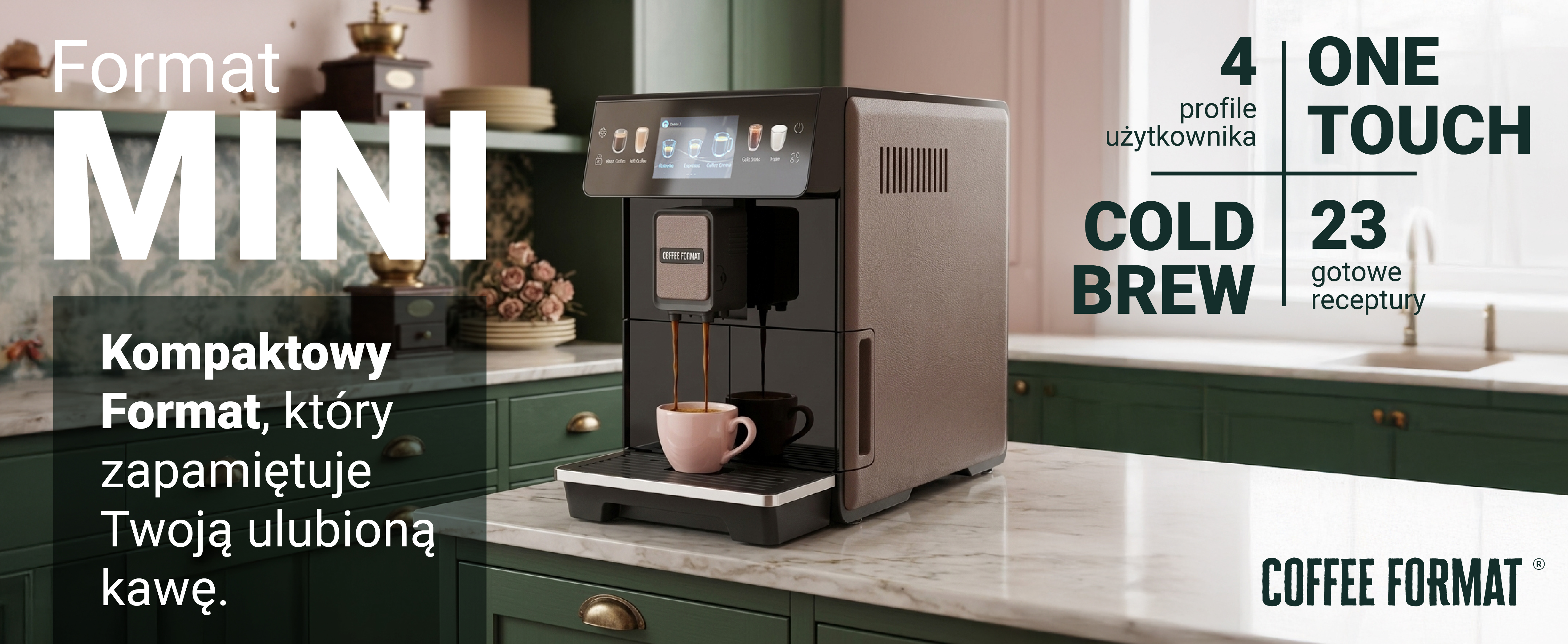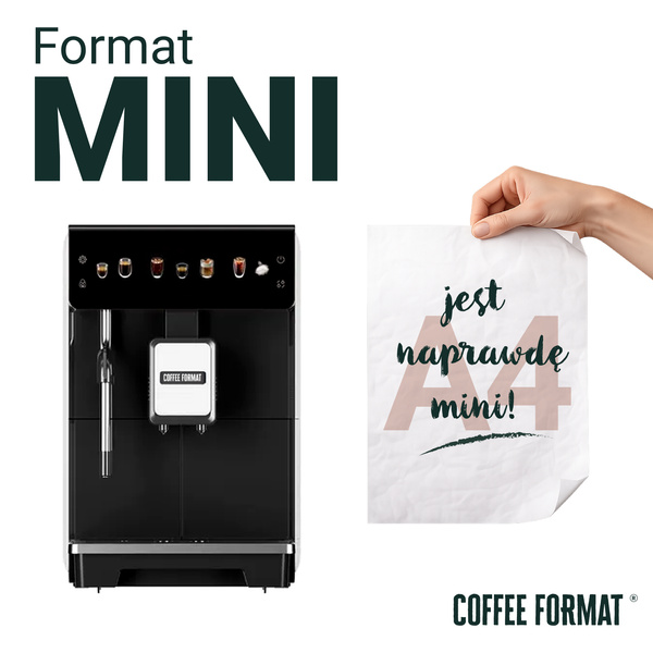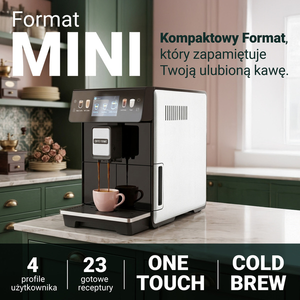 Nawet 70% społeczeństwa sięga rano po kawę. To moment, który często definiuje cały dzień. Właśnie dlatego w naszej ofercie nie mogło zabraknąć małego i przystępnego Formatu, który sprawdzi się w domu i małym biurze. MINI, jak sama nazwa wskazuje, jest niewielki – ale kawa, którą serwuje, potrafi naprawdę poprawić poranek. MINI BROWN MINI_-_bannery-04 Ekspres, który pamięta jaką kawę lubisz: Ekspres do domu i małego biura powinien serwować ulubione specjały kawowe bez skomplikowanej konfiguracji, a jednocześnie pozwalać na pełną personalizację smaku. Format MINI oferuje przejrzysty ekran dotykowy z klasycznymi napojami i propozycjami Cold Brew – gotowymi od pierwszego włączenia. Możesz także zmienić recepturę, wzmocnić kawę i zapisać ustawienia na własnym profilu użytkownika. Nazwij swój profil jak chcesz, dodaj zdjęcie i ciesz się swoją ulubioną kawą każdego dnia – dokładnie taką, jak lubisz. 4 ONE TOUCH 23 profile użytkownika kawy mleczne one touch gotowe receptury Mała kuchnia to nie problem dla Formatu MINI – zmieści się Podczas projektowania przestrzeni lub dobierania ekspresu do swojej kuchni często okazuje się, że kluczowa jest jego kompaktowość. To trochę jak gra w Tetris – wiele ekspresów oferuje świetne funkcje, ale finalnie nie pasują do wnętrza, bo są po prostu za duże. FORMAT MINI wyróżnia się swoją wąską konstrukcją na tle urządzeń w tej klasie. Dzięki temu bez problemu zmieści się nawet w niewielkiej przestrzeni, dając użytkownikom dużą swobodę i codzienną przyjemność z kawy. Kawa na zimno w upalne dni to świetny pomysł Wyobraź sobie ciepły, letni dzień – masz ochotę na kawę, ale pogoda zdecydowanie sprzyja zimnym napojom. Właśnie dlatego FORMAT MINI oferuje nie jedną, nie dwie, ale aż 7 receptur Cold Brew, czyli kawy podawanej na zimno. Możesz dodać kilka kostek lodu, odrobinę pomarańczy i cieszyć się jedną z najbardziej orzeźwiających kaw pod słońcem. Nie musisz pić jednej mieszanki kawy Wiele ekspresów domowych posiada zbyt duże zbiorniki na ziarno, przez co przez długi czas korzystamy z jednej mieszanki kawy. W Polsce działa wiele świetnych palarni, które tworzą tak dobre blendy, że aż szkoda ograniczać się tylko do jednego. Dlatego FORMAT MINI został wyposażony w zbiornik o pojemności 150 g - naszym zdaniem to idealny kompromis, który pozwala zachować świeżość ziaren i cieszyć się pełnią smaku. Format MINI w wersji z automatycznym spienianiem mleka Większość kawoszy wybiera kawę z mlekiem - badania pokazują, że aż 80% osób pije kawę z tym dodatkiem. FORMAT MINI pozwala jednym przyciskiem przygotować ulubione latte czy cappuccino, a po zakończeniu automatycznie przepłukuje dyszę spieniającą, dbając o higienę i powtarzalny smak każdej kolejnej kawy. Z MINI wszystko jest prostsze.