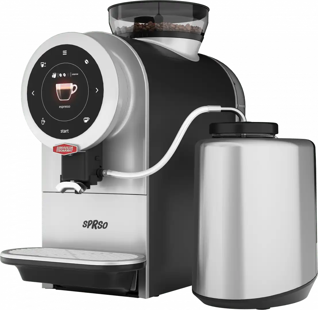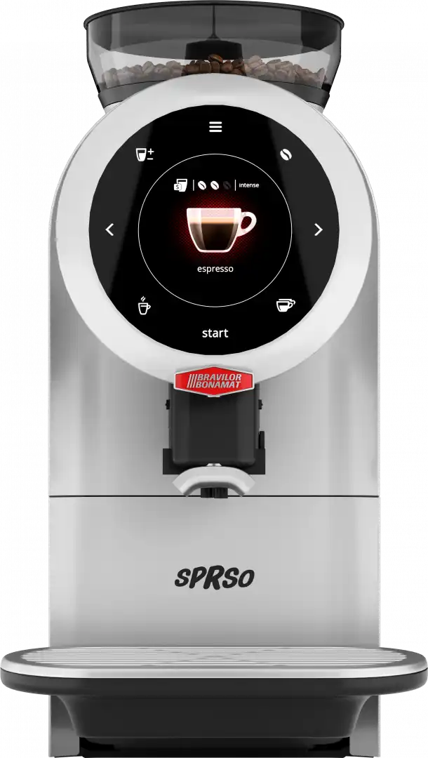 Ekspres do kawy, automatyczny, kompaktowy - model SPRSO, marki Bravilor Bonamat. Wyposażony w młynek i pojemnik na ziarna kawy. Model SPRSO przygotowuje takie kawy jak ristretto, espresso, caffè crema czy americano, a także gorącą wodę. Dzięki opcjonalnej chłodziarce do mleka* może także przygotować pyszne cappuccino i latte. Sprso doskonale nadaje się do sal konferencyjnych, poczekalni i małych biur. Niewielki rozmiar sprawia, że Sprso sprawdza się także na blacie kuchennym w domu. Ma wyjątkowy kształt Przygotowuje kawę ze świeżo zmielonych ziaren Robi napoje kawowe ze świeżo spienionym mlekiem Jest prosty i intuicyjny w obsłudze Może przygotować dwa napoje jednocześnie (ristretto, espresso i caffè crema) Umożliwia dostosowanie wielkości filiżanki, mocy i intensywności napoju oraz stopnia zmielenia ziaren do indywidualnych preferencji Został wykonany z solidnych materiałów wysokiej jakości: stali nierdzewnej i tworzyw sztucznych niezawierających bisfenolu Jest wyposażony w profesjonalny zaparzacz CIRCO Zużywa wyjątkowo mało energii w trybie czuwania (< 0,5 W) Możesz rozpakować, podłączyć ekspres i cieszyć się pierwszą kawą ze świeżo zmielonych ziaren w ciągu zaledwie 10 minut. Zalecane filiżanki dziennie Do 30 Zbiornik na wodę: 2,2 L Pojemnik na kawę ziarnistą 1 x 300 g Liczba użytkowników 5-10 użytkowników Zasilanie 220-240V~ 50/60Hz 1840W Wymiary SxGxW 215x440x420 mm Wysokość wylewki pod: filiżankę 80-115 mm Etykieta energetyczna A++ *Chłodziarka do mleka Sprso firmy Bravilor Bonamat nie jest elementem wyposażenia ekspresu - do zakupienia osobno. Opcja podłączenia do stałego zasilania wodą - akcesorium do zakupienia osobno, prosimy o wcześniejszy kontakt.