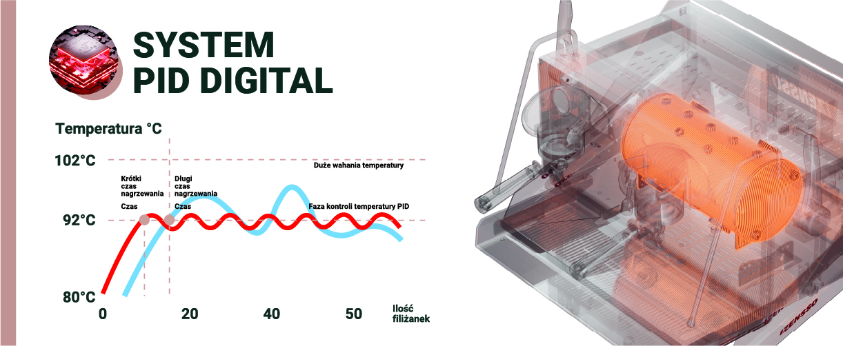 T3 Multi-Boiler System T3 Multi-Boiler w ekspresie RAPTOR składa się z niezależnie sterowanych bojlerów: jednego parowego o pojemności 5l (wersja 1 grupowa) / 11 litrów (wersja 2 grupowa) / 15l (wersja 3 grupowa) oraz bojlerów wody o pojemności 1,5 litra (ilość bojlerów wody zależna od ilości grup). Każdy z nich jest termicznie izolowany, co minimalizuje straty ciepła i zwiększa ich efektywność. Dzięki osobnej kontroli temperatury dla każdego bojlera możliwa jest jednoczesna praca z różnymi ustawieniami, co przekłada się na stabilność, precyzję i powtarzalność ekstrakcji dla różnych rodzajów kawy. System ten gwarantuje najwyższą jakość pracy nawet przy dużym obciążeniu. System PID Digital PID to zaawansowany system kontroli temperatury, który odpowiada za jej stabilność podczas całego procesu parzenia. Steruje grzałkami i współpracuje z oprogramowaniem ekspresu, minimalizując wahania temperatury do ±0,5°C. Dzięki temu każda filiżanka kawy jest powtarzalna i zgodna ze standardami jakości. System PID gwarantuje precyzję, która przekłada się na pełnię smaku i aromatu. To rozwiązanie niezbędne w profesjonalnych lokalach, gdzie liczy się kontrola i niezawodność.