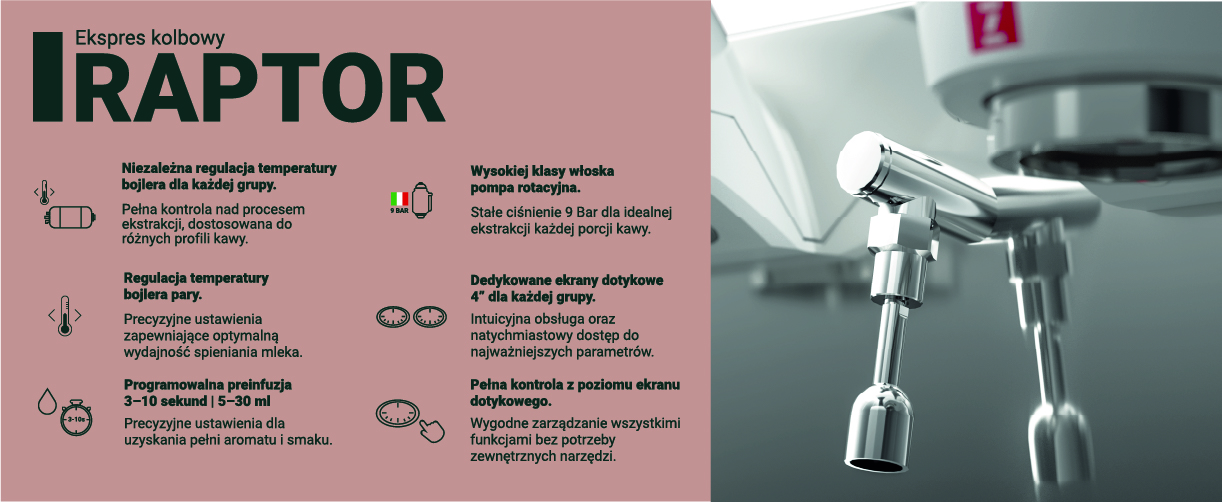 Ekspres kolbowy RAPTOR RAPTOR to jeden z najbardziej zaawansowanych technologicznie ekspresów kolbowych, z jakimi miałeś do czynienia. Design i ergonomia współgrają tu z najwyższą jakością wykonania oraz innowacyjnymi rozwiązaniami, takimi jak system PID Digital oraz T3 Multi-Boiler z niezależną kontrolą temperatury dla każdej z grup. Dotykowy ekran umożliwia pełną kontrolę nad procesem ekstrakcji, a funkcje automatycznego czyszczenia, oszczędzania energii i mieszania wody ułatwiają codzienną obsługę. RAPTOR oferuje powtarzalność i niezawodność nawet przy intensywnym użytkowaniu. Włącz go jednym przyciskiem i odkryj rozwiązania, których nie będziesz chciał już zastąpić innymi.